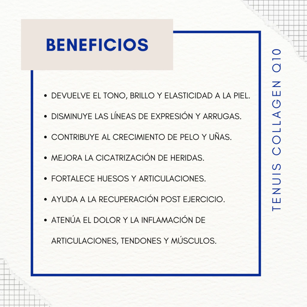 Los 10 grs. de Péptidos Bioactivos de Colágeno Hidrolizado presentes en TENUIS COLLAGEN Q10 se absorben en forma inmediata reponiendo las deficiencias de colágeno en tu cuerpo.