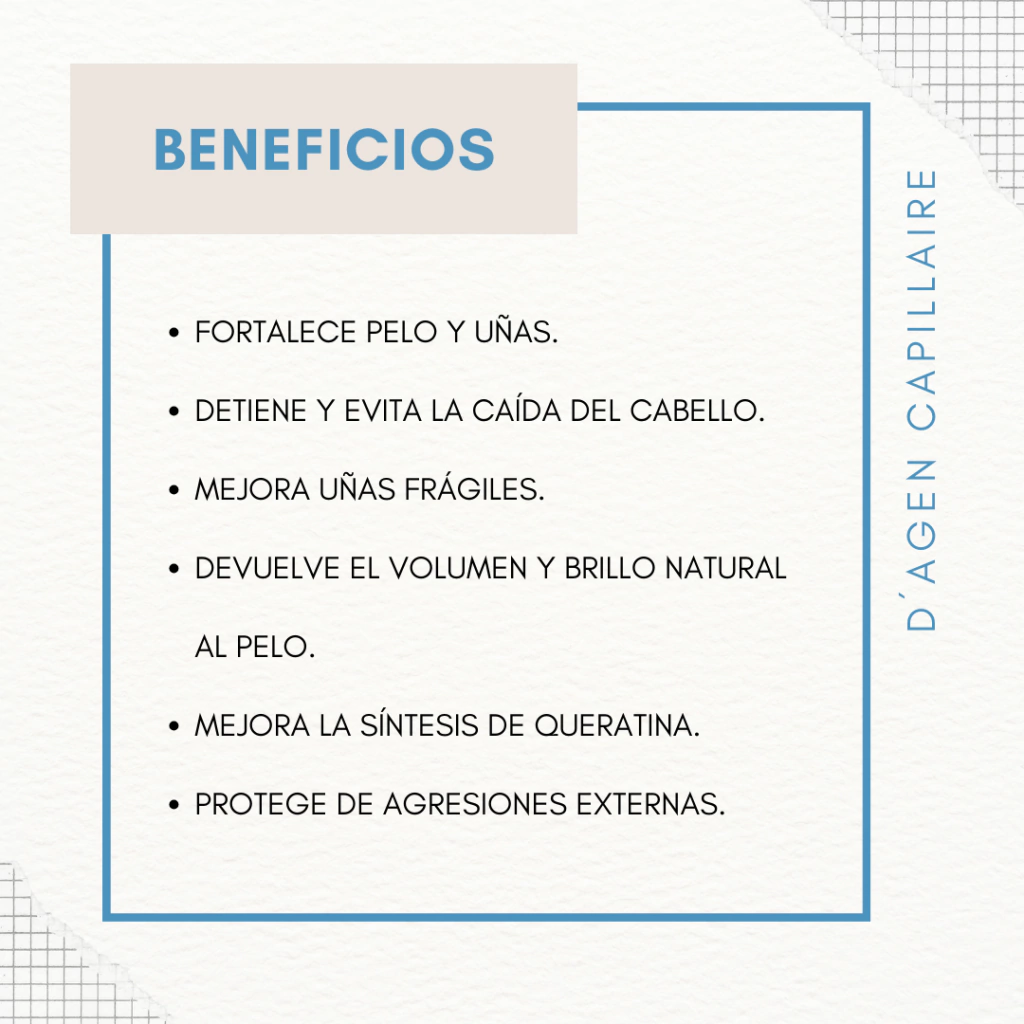 Contiene Péptidos Bioactivos de Colágeno Hidrolizado, Vitamina C, L-Cistina, Vitamina B5 (Ácido Pantoténico), Óxido de Zinc, Biotina y Vitamina B6.